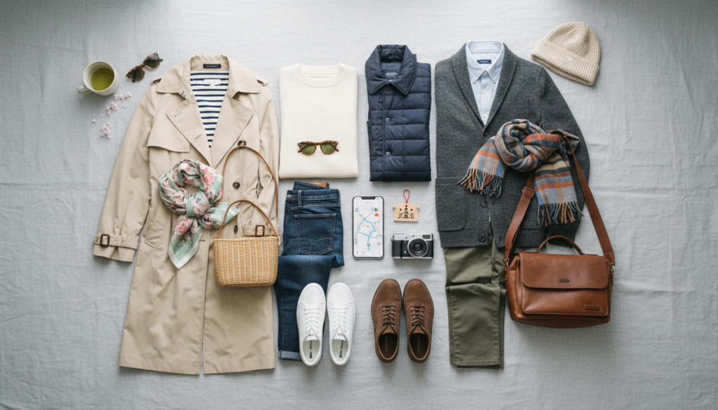 デートでの服装選びは重要です。脱ぎ着しやすいレイヤードスタイルがおすすめ。石畳を歩く距離が長くなるため、ヒールよりもおしゃれなスニーカーや歩きやすいブーツを選びましょう。