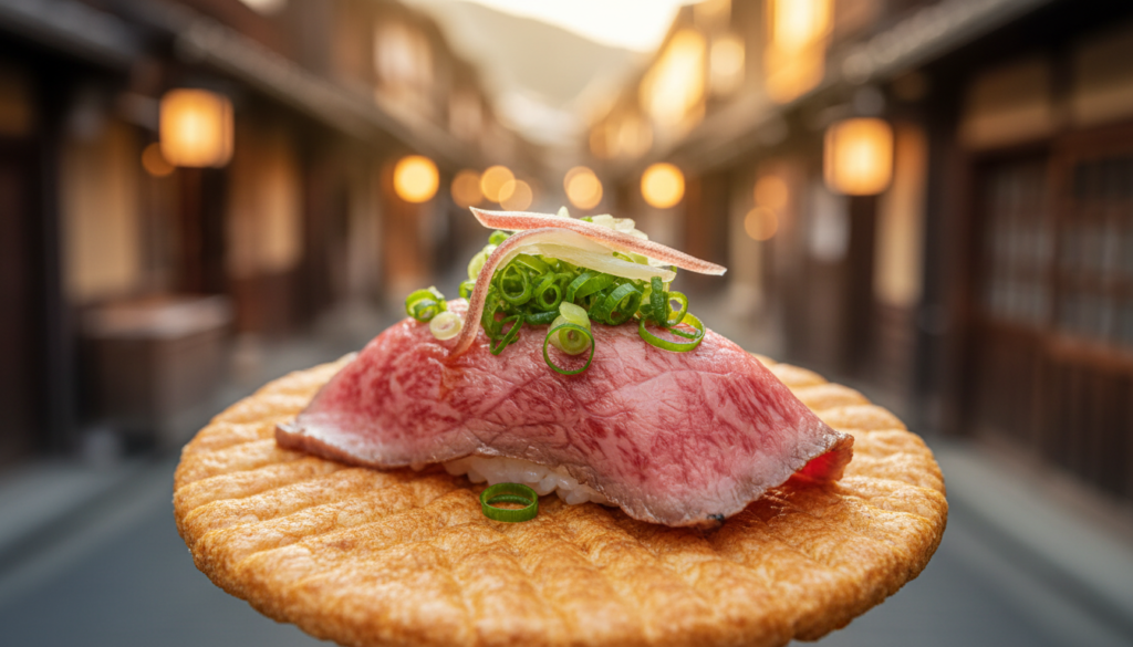飛騨高山に来たら外せないのが飛騨牛の握り寿司。人気店「こって牛」などは行列必至ですが、開店直後や、あえてお昼時の12時〜13時(みんながランチ店に入っている時間)を狙うのがAI的な穴場タイムです。