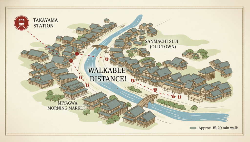 主要な観光スポットは徒歩圏内に集まっています。もし奥飛騨温泉郷や白川郷まで足を伸ばす場合は、レンタカーがあると便利です。