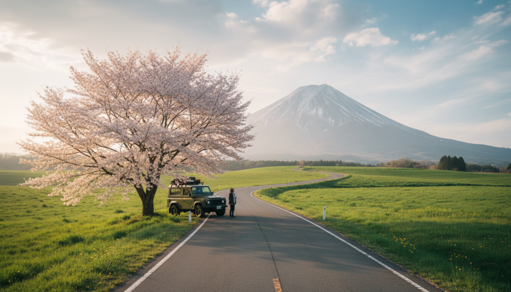 9時以降はレンタカーに乗り込み、岩木山麓の穴場スポットへ向かいます。「世界一の桜並木」と呼ばれる岩木山総合公園周辺の約20km続くオオヤマザクラの並木道は、ドライブに最適です。AIによる渋滞予測を活用し、メインの県道を避けた裏道を走ることで、スムーズに移動できます。