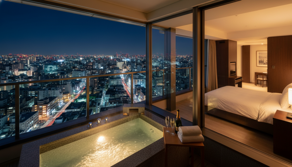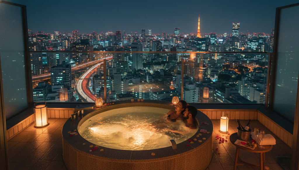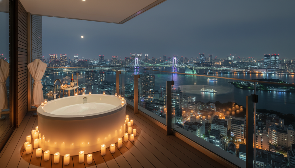 お台場エリアに位置し、東京湾の夜景を一望できるテラスにバスタブが設置されています。厳密には温泉ではありませんが、非日常的な開放感はバレンタインにぴったりです。ルームサービスでシャンパンを頼めば、一気に高級ホテルさながらの雰囲気に。