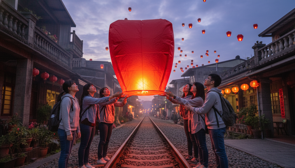 午前:ローカル線に乗って「十分」へ。線路のど真ん中で、恋愛成就や就職祈願など、それぞれの願い事を書いた大きなランタンを空に飛ばしましょう。動画撮影必須のアクティビティです!