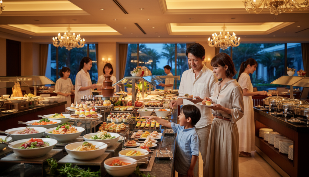 食事もホテル選びの重要なポイントです。ホテル内には本格的なスペイン料理レストランや日本料理店もありますが、子連れファミリーに一番人気なのはディナーバイキングです。伊勢志摩の海の幸を使った料理から、子どもが大好きなハンバーグやエビフライ、そしてパエリアやチュロスなどのスペイン名物まで、幅広いメニューが並びます。チョコレートファウンテンなどのデザートコーナーも充実しており、子どもたちが自分で選んで食べる楽しさを味わえます。