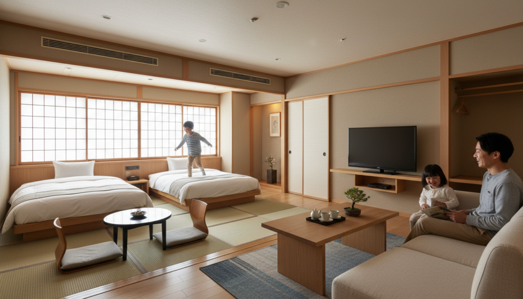 和室はなく、基本は洋室のみのため、赤ちゃんのハイハイ期・布団で寝たい家庭にはやや不向きです。ただしその分、価格と立地のバランスは非常に優秀で、「とにかく宿泊費を抑えたい」家庭には最適な選択肢です。