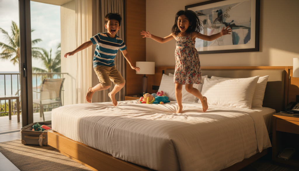 - デメリット: 和室はなく、基本は洋室のみのため、赤ちゃんのハイハイ期・布団で寝たい家庭にはやや不向きです。ただしその分、価格と立地のバランスは非常に優秀で、「とにかく宿泊費を抑えたい」家庭には最適な選択肢です。
